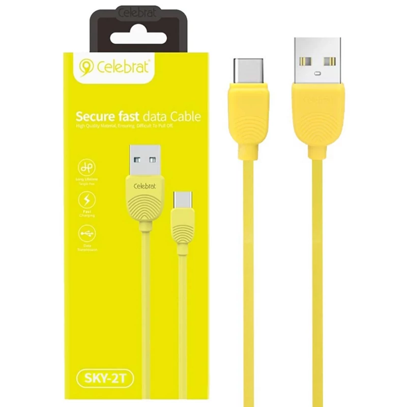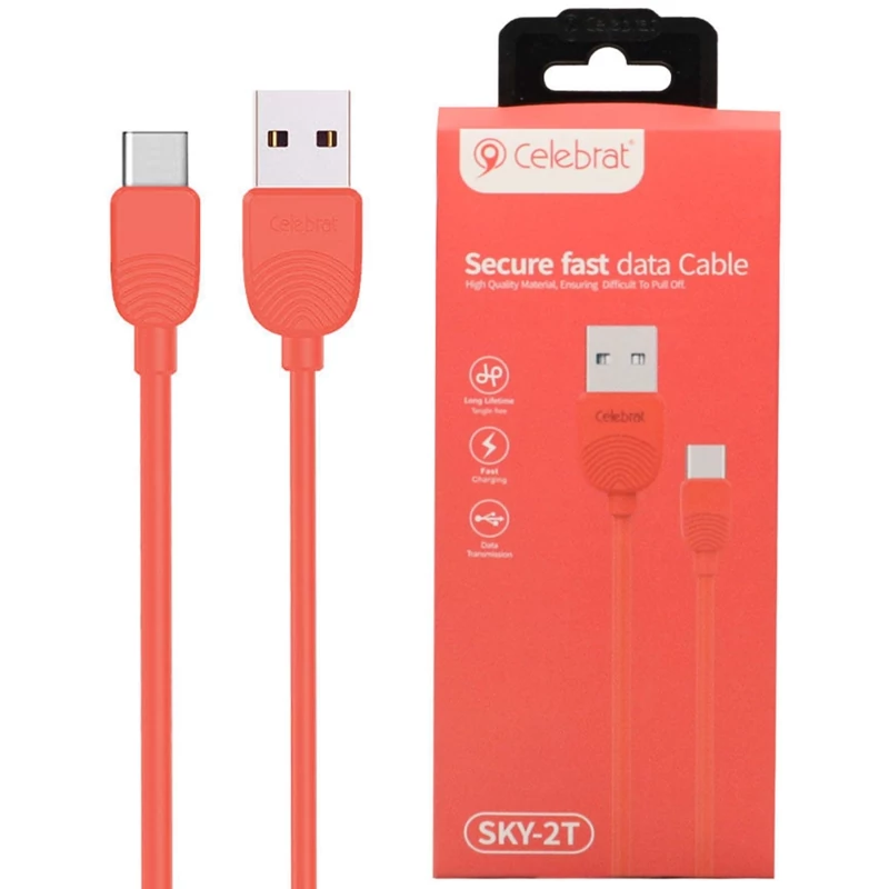کابل فست شارژ SKY-2T تولید شرکت سلبریت می باشد و طراحی ظریفی دارد این کابل 100 سانتیمتر طول دارد و با انواع گوشیهای موبایل، تبلت، دوربینهای دیجیتال و دیگر لوازم مجهز به درگاه USB-C سازگار است. در یک سمت از این کابل یک کانکتور USB-C و در سمت دیگر آن یک کانکتور USB به کار رفته است. شما میتوانید کانکتور USB موجود در این کابل را به یک دستگاه مجهز به این درگاه مانند کامپیوتر یا لپتاپ متصل کنید؛ سپس سمت دیگر کابل را به تبلت یا گوشی موبایلتان وصل کرده و اطلاعات را میان آنها انتقال دهید. همچنین این امکان وجود دارد که کانکتور USB کابل را به یک شارژر دیواری متصل کرده و باتری گوشی موبایل یا تبلت خود را شارژ کنید همچنین میتوان از آن بهعنوان کابل یدک مخصوص استفاده برای شارژر فندکی و پاوربانک استفاده کرد. رشتههای مسی داخل این کابل با روکشی از جنس PVC و سیلیکون پوشانده شدهاند. این روکش مقاوم است و باعث میشود کابل در برابر گره خوردن یا درهم پیچیدن مقاومت زیادی داشته باشد. سرعت انتقال اطلاعات و شارژ در این محصول به صورت فست شارژ می باشد.